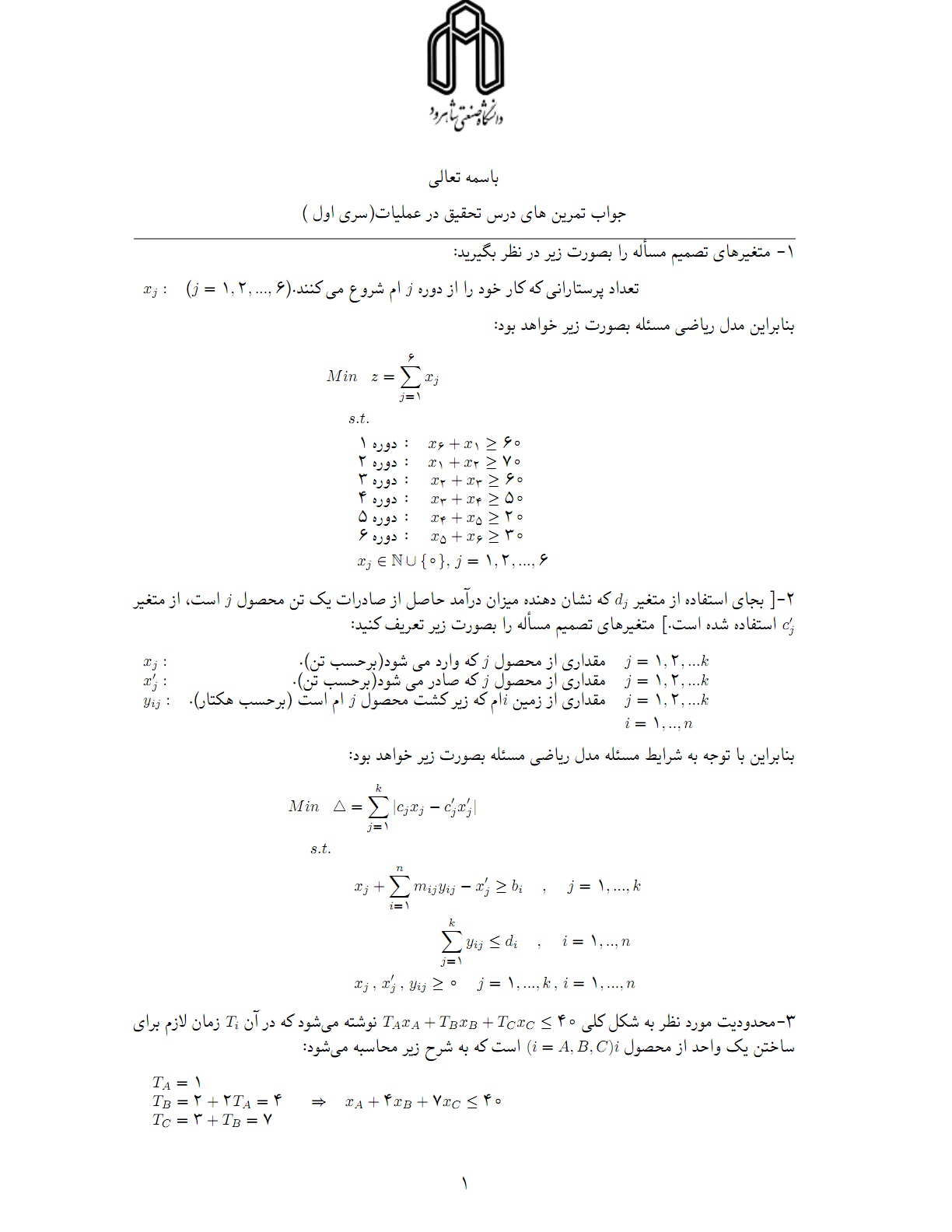 درس تحقیق در عملیات ارائه شده در نیمسال اول سال تحصیلی 93-92 دانشگاه شاهرود